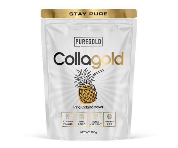 CollaGold (beef & fish) - colagen din vită și pește, cu vitamine și acid hialuronic. Pudră solubilă aromată, cu colagen hidrolizat din vită și pește marin, îmbogățită cu pudră de cartilaj de pui hidrolizat, hidrolizat din membrană de coajă de ou, vitamine, zinc, seleniu și îndulcitori.